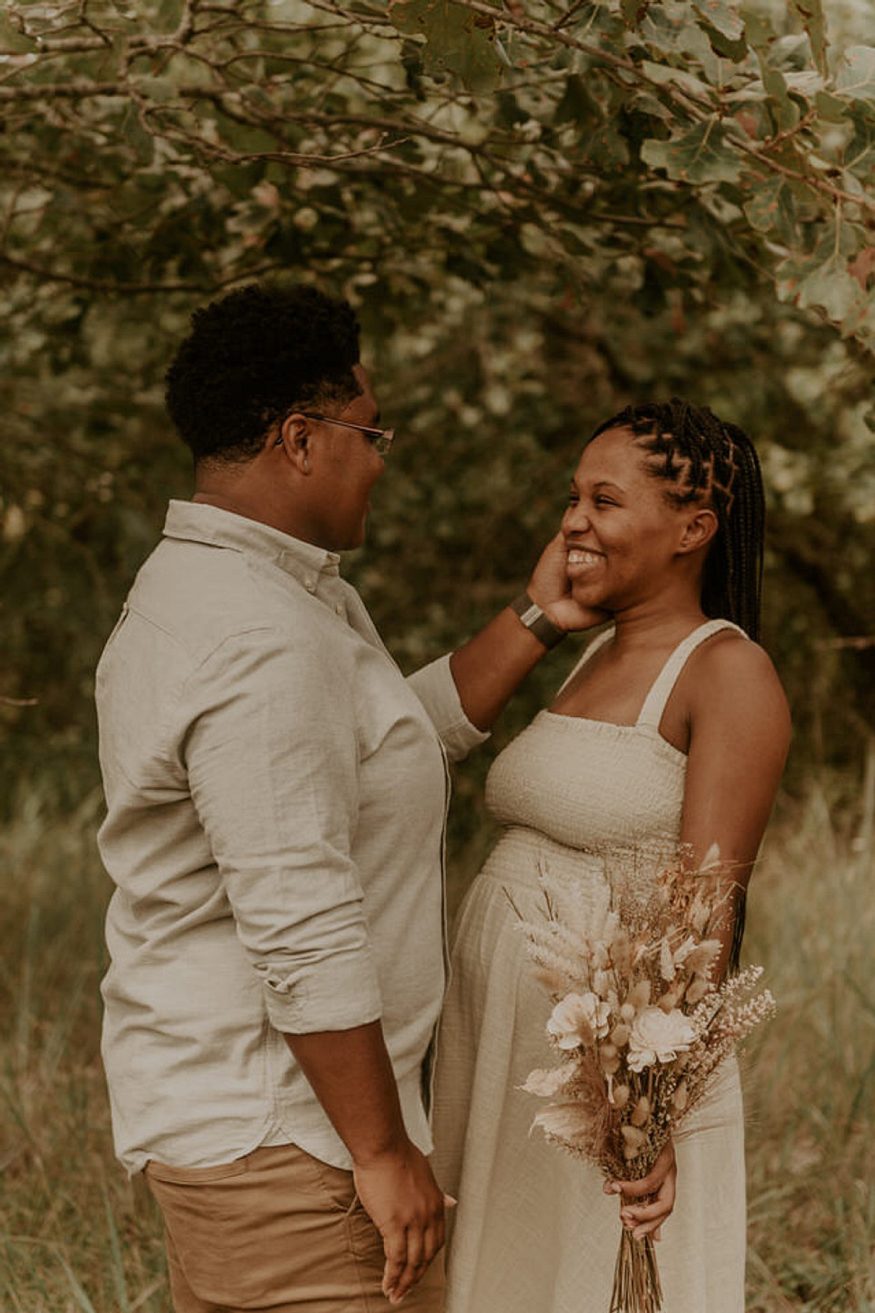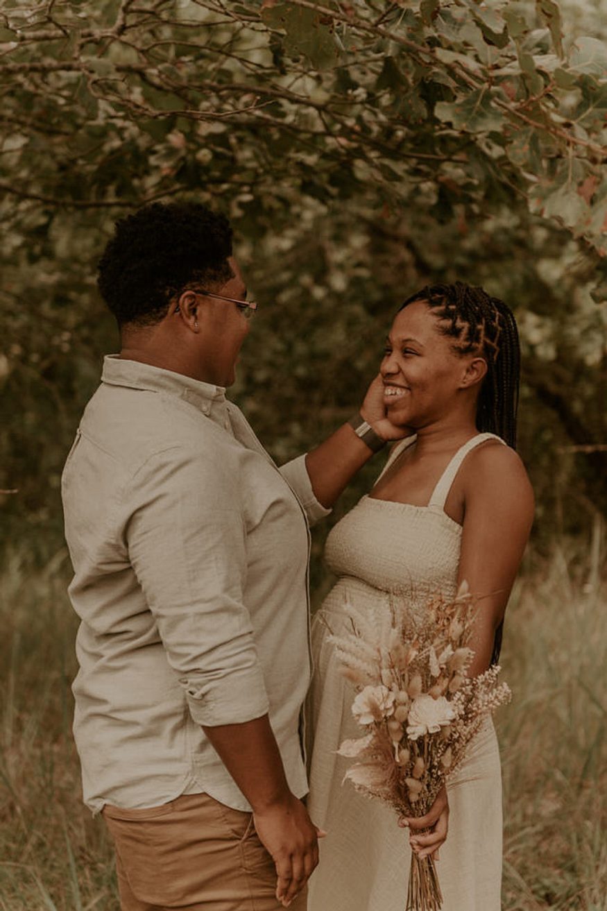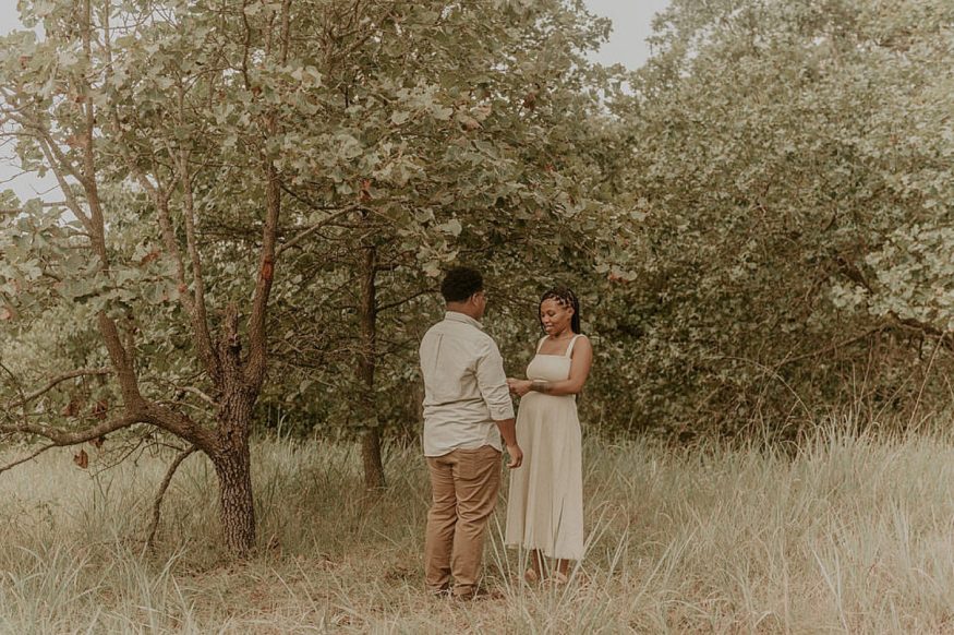 A: So being 6 months pregnant at the time definitely created a struggle with finding outfits for our wedding day. Neither of us are into big traditions or fancy weddings attire. So we chose green and linen, then it was very easy after that.