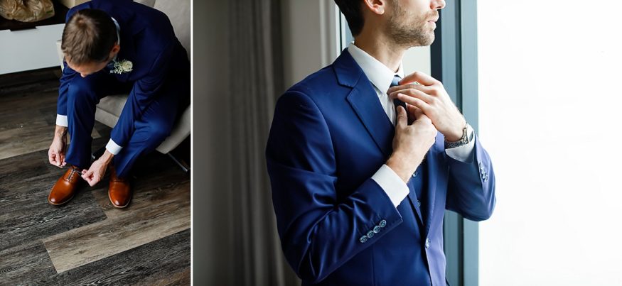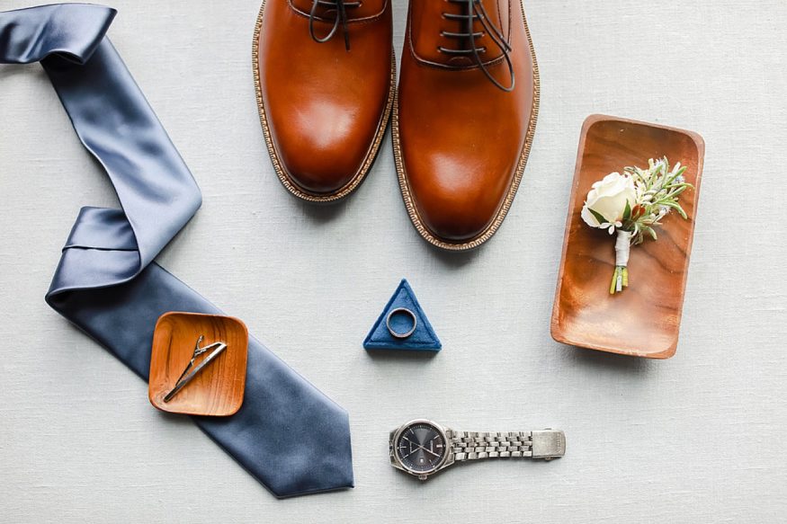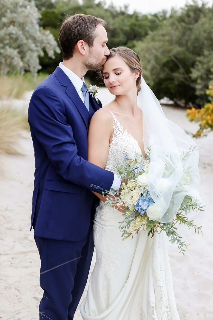 A: I knew that I wanted a classic and elegant dress. At the first wedding dress boutique I went to I tried on about 15 dresses and was shocked when I found me dress. I never thought that I would have that ‘bridal moment’ but when I put my dress on I knew it was the one and began to tear up. It was so perfect I said ‘yes to the dress’ before I had even checked the price! Luckily it was within budget! Bennet chose his own suit, which we ordered the The Groomsman Suit. We loved the way that the blues in the suit worked with the blues in my bouquet.