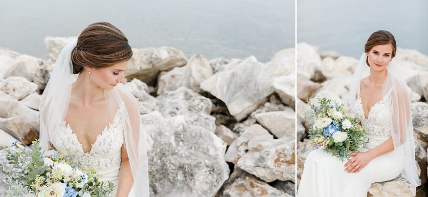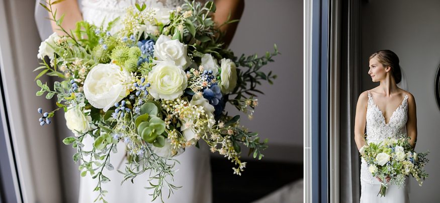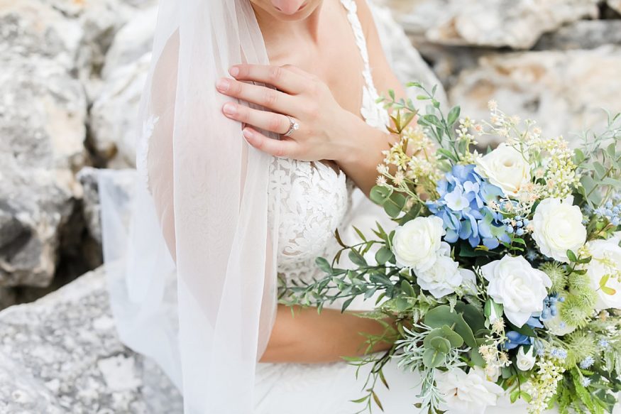 A: Originally we had planned a large wedding with over 250 guests. When Covid-19 began to spread through the US we quickly realized our wedding plans were going to change. We ended up eloping with just the two of us. It was a very simple ceremony with a clean and classic palette of blues and white. I had already purchased my bouquet from The Faux Bouquets on Etsy and that was really the centerpiece of our wedding.