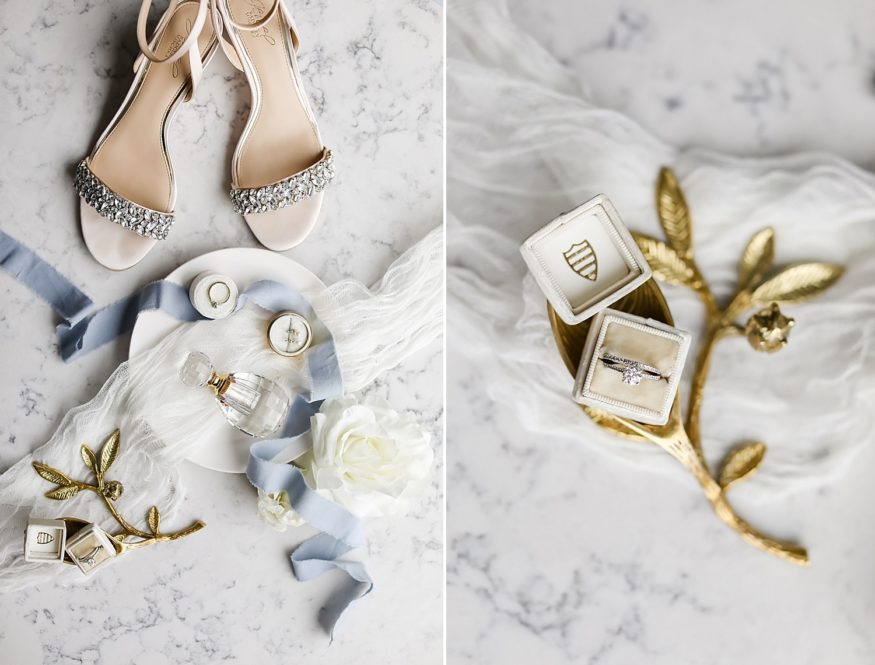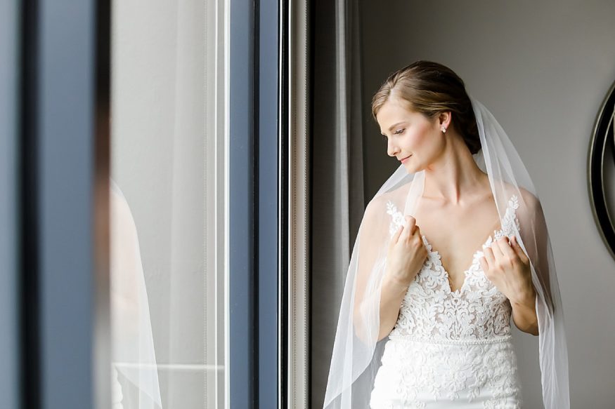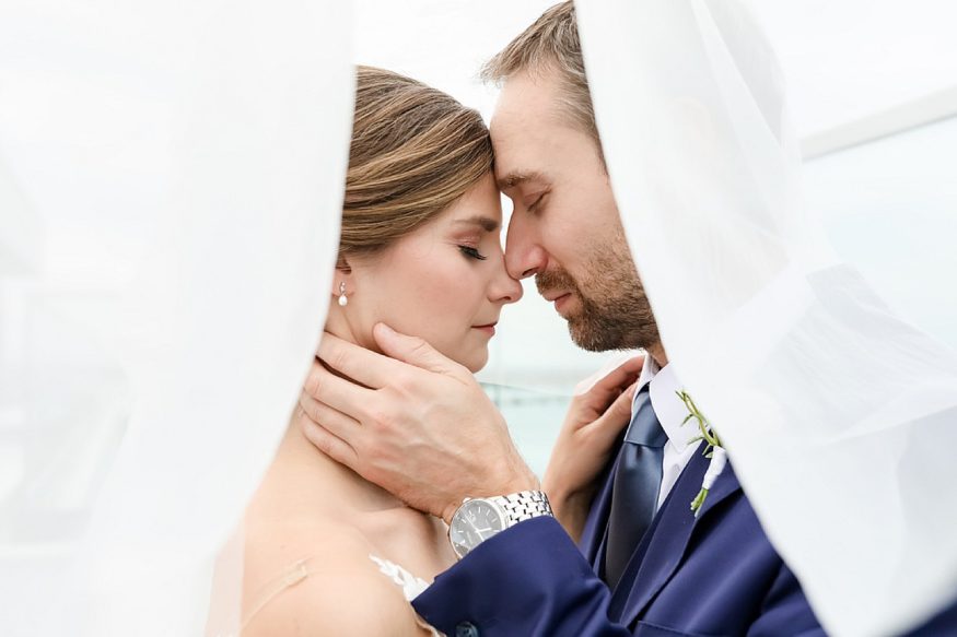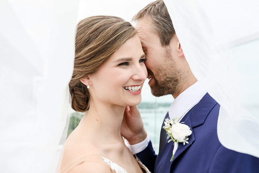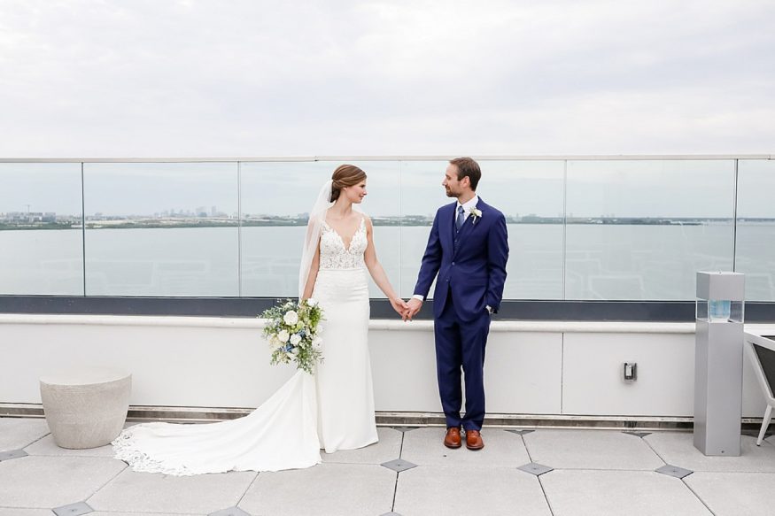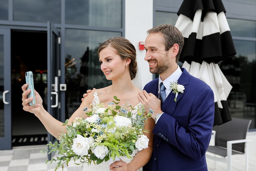 A: Although we couldn’t have guests, we made it a point to FaceTime both of our families throughout the day. My bridal party and my mother video chatted with me while I had my hair and makeup done and Bennet was able to chat with each of his groomsmen before the ceremony. The most meaningful and emotional part of all of this was when we were able to FaceTime my father before I walked down the aisle. There wasn’t a dry eye between us! It was so special for him to be able to see me since he wasn’t able to walk me down the aisle. After the ceremony we celebrated with our families via video chat. Bennet’s family even surprised us by being dressed to the nines and having champagne in hand!