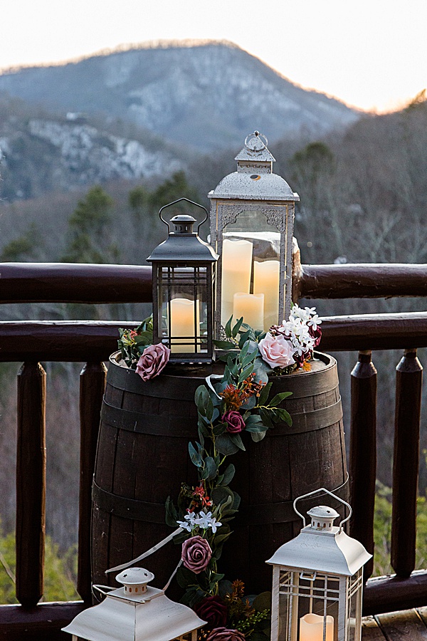 In an effort to travel with less and in keeping with the theme of simplicity, I studied photos of the interior and exterior of the cabin to plan the ceremony location, and to try to incorporate existing cabin furnishings and décor that could be used in the ceremony. Since we wanted to say our vows outdoors at dusk to the backdrop of the sunset, but needed some lights and height at the altar, I decided to incorporate large lanterns with the whiskey barrels that lived at the front door of the property. Between the lanterns, barrels and thirty or so flameless candles and lots of florals and greenery we were able to create a simple and beautiful ceremony site. We had a cake and champagne toast at the cabin, and later we all went to the local steakhouse for dinner.