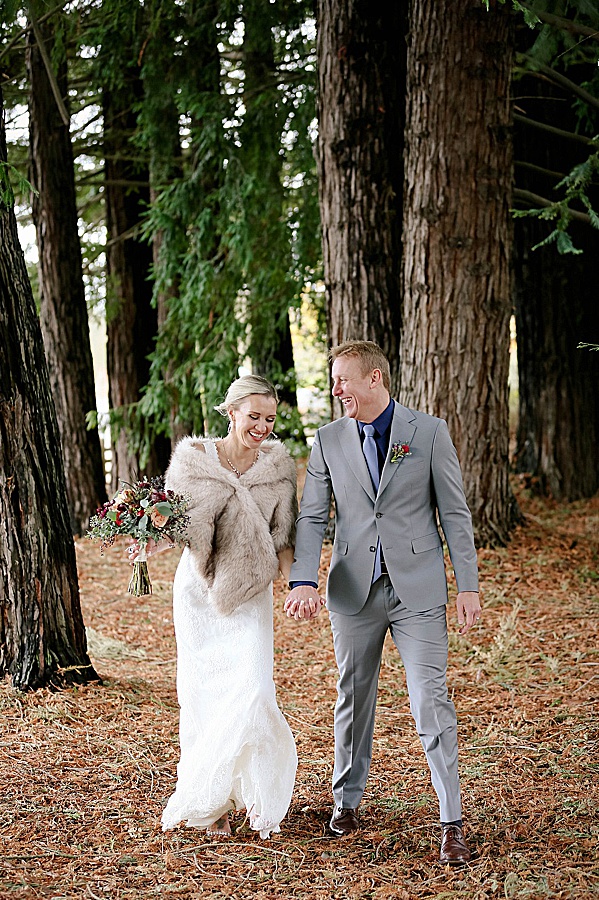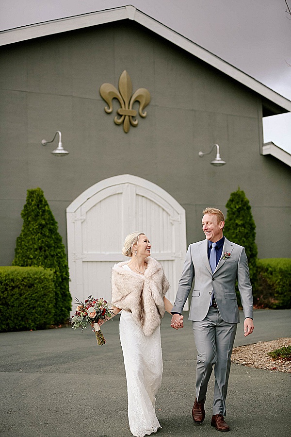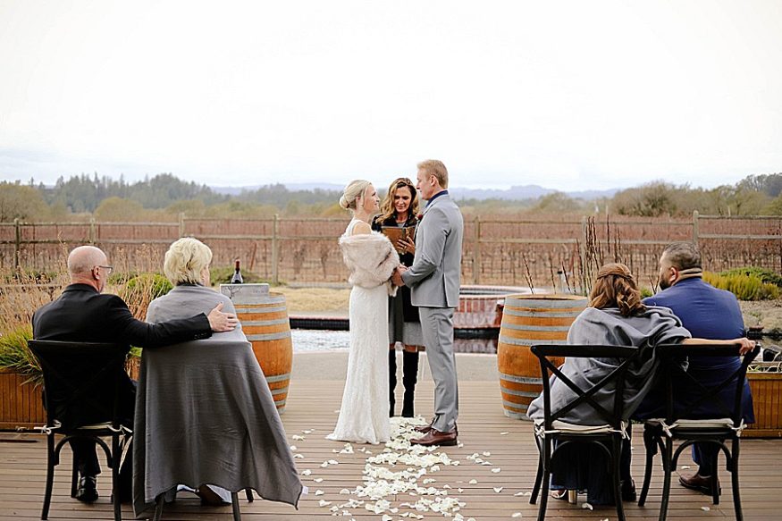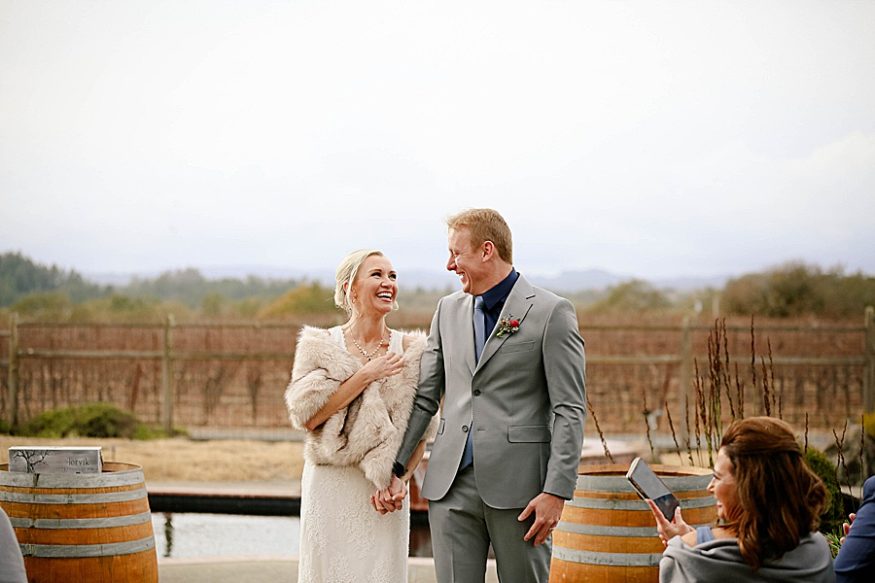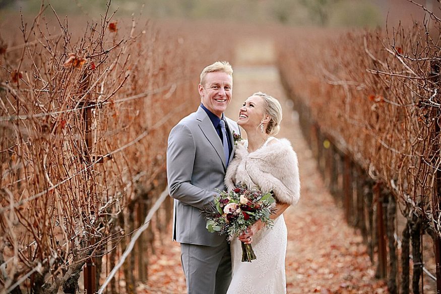 “Amber and Josh originally met 21 years ago and had small crushes on each other at the time. Little did they know that they had just met their future spouses. They parted ways and built successful happy lives. After awhile and many life changes the pair got a chance to re-meet 4 years ago. They immediately felt a connection, and when they started planning their wedding they wanted it to really be a celebration of their love without any of the fuss. The couple chose wine country in the fall because of the romance of it (just like their relationship). With just a few family members attending, and their amazing wedding planners Run Away With Me, the couple showed up to the venue and enjoyed getting married in the serene vineyards of Sonoma Valley. The bride accessorized for the cool temperatures with a wrap and kept her look elegant.