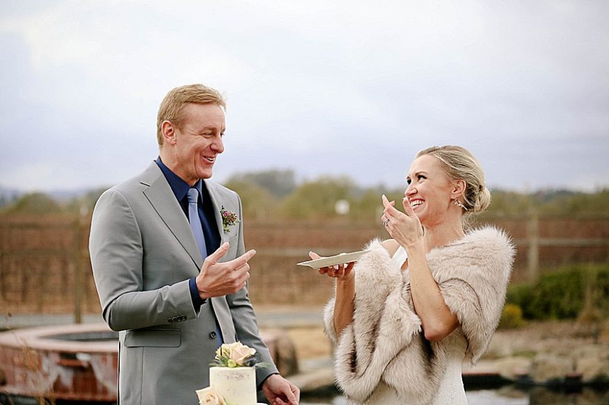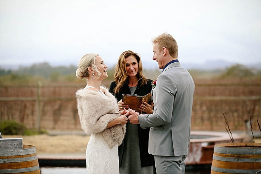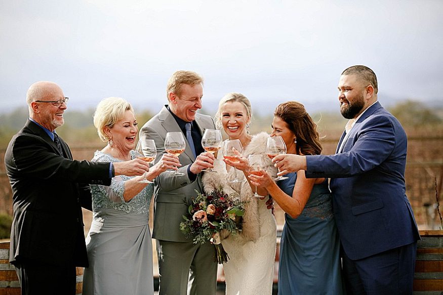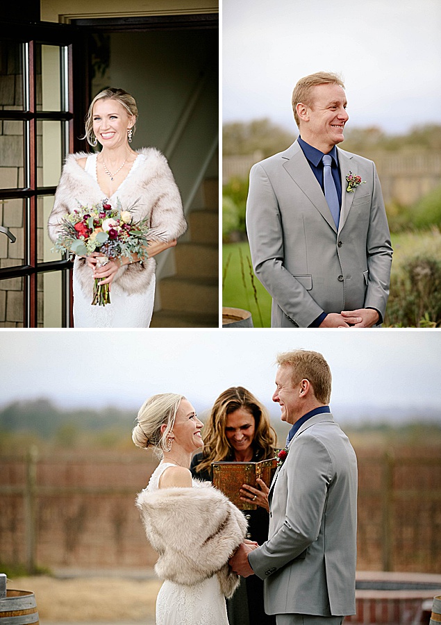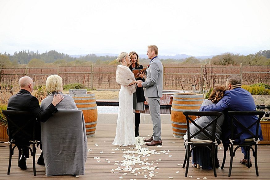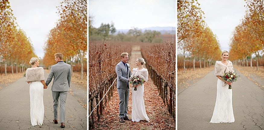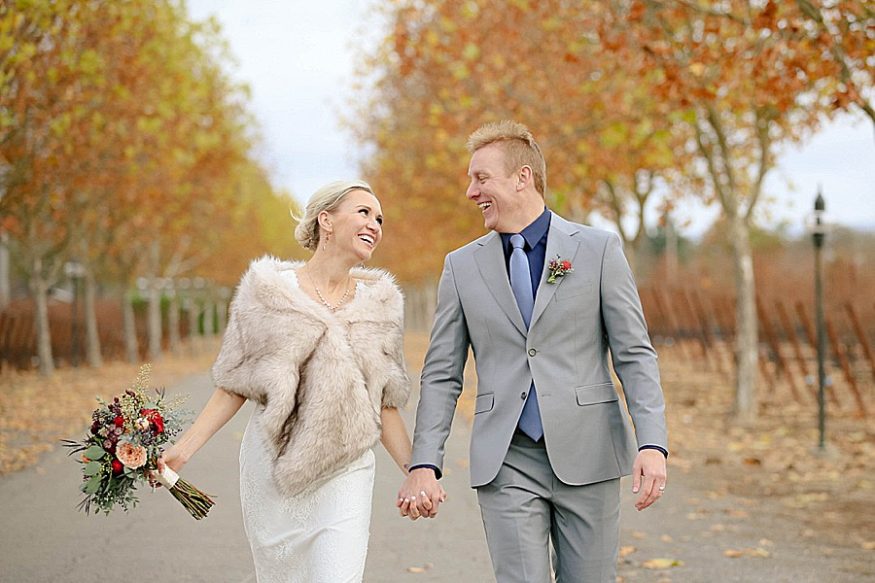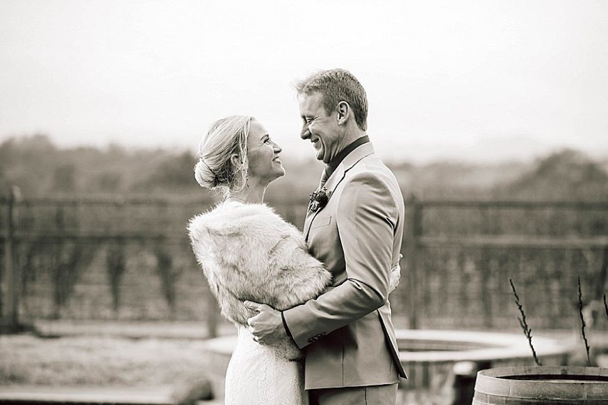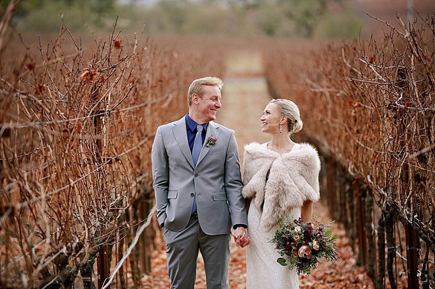 “Amber and Josh originally met 21 years ago and had small crushes on each other at the time. Little did they know that they had just met their future spouses. They parted ways and built successful happy lives. After awhile and many life changes the pair got a chance to re-meet 4 years ago. They immediately felt a connection, and when they started planning their wedding they wanted it to really be a celebration of their love without any of the fuss. The couple chose wine country in the fall because of the romance of it (just like their relationship). With just a few family members attending, and their amazing wedding planners Run Away With Me, the couple showed up to the venue and enjoyed getting married in the serene vineyards of Sonoma Valley. The bride accessorized for the cool temperatures with a wrap and kept her look elegant.