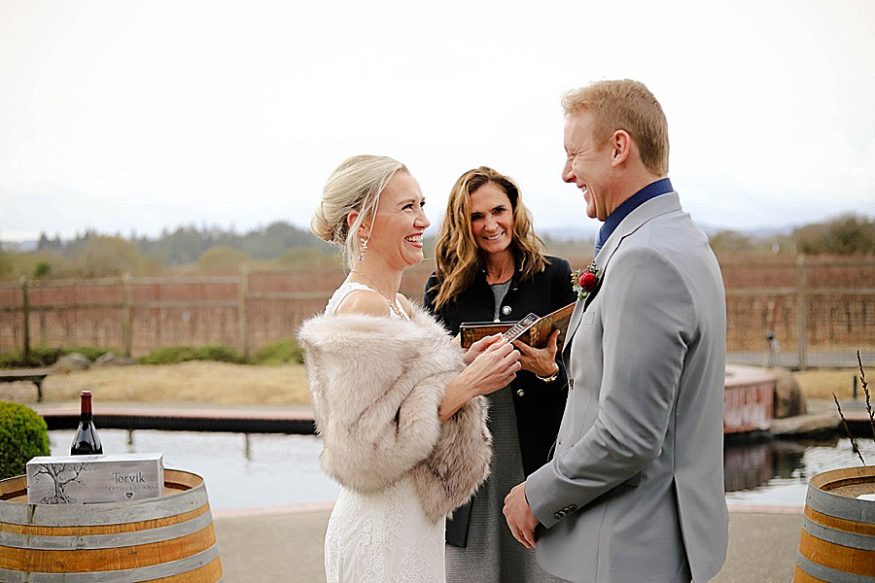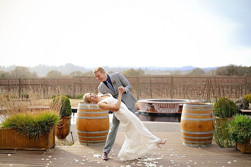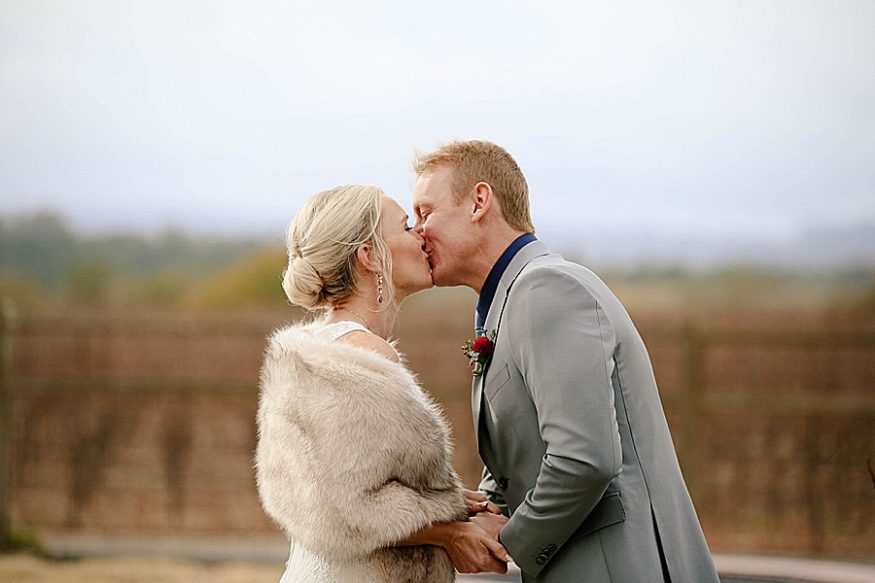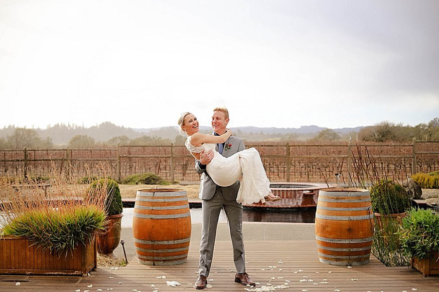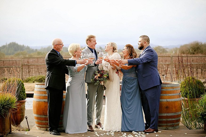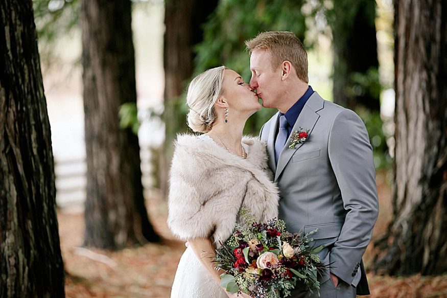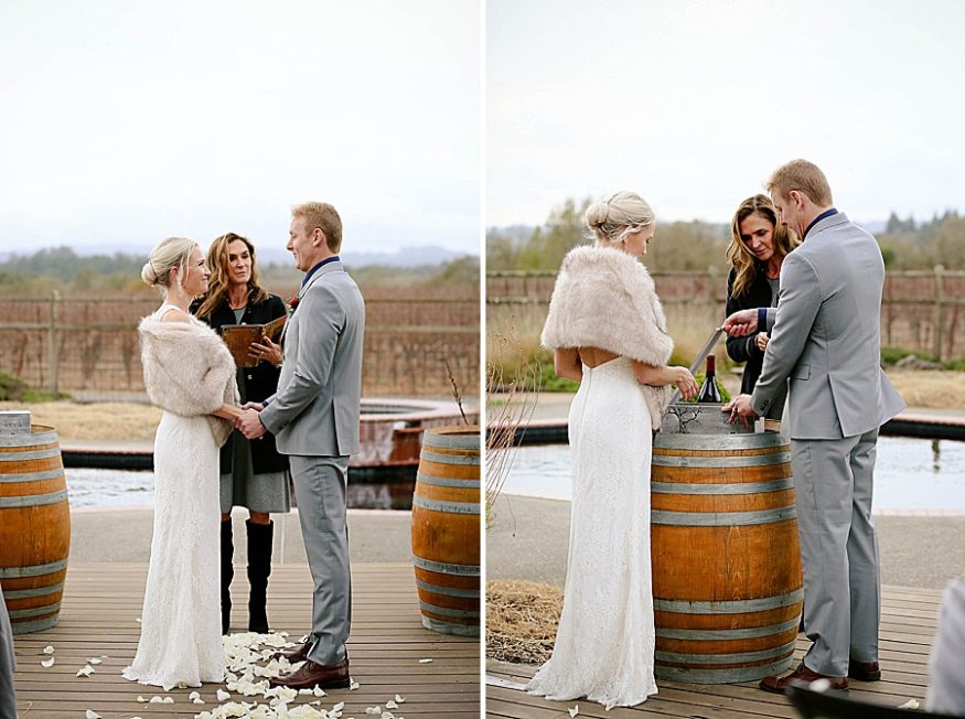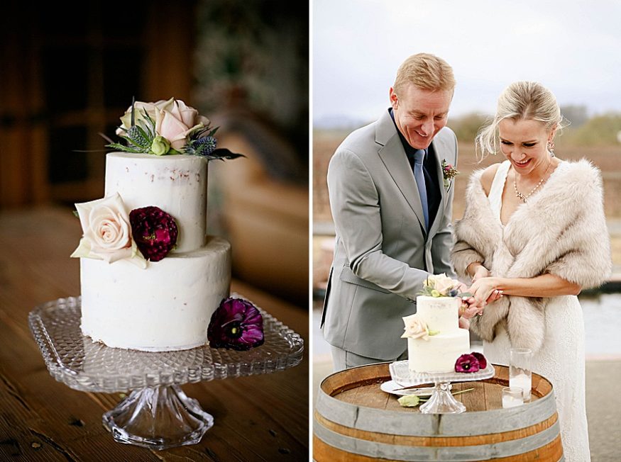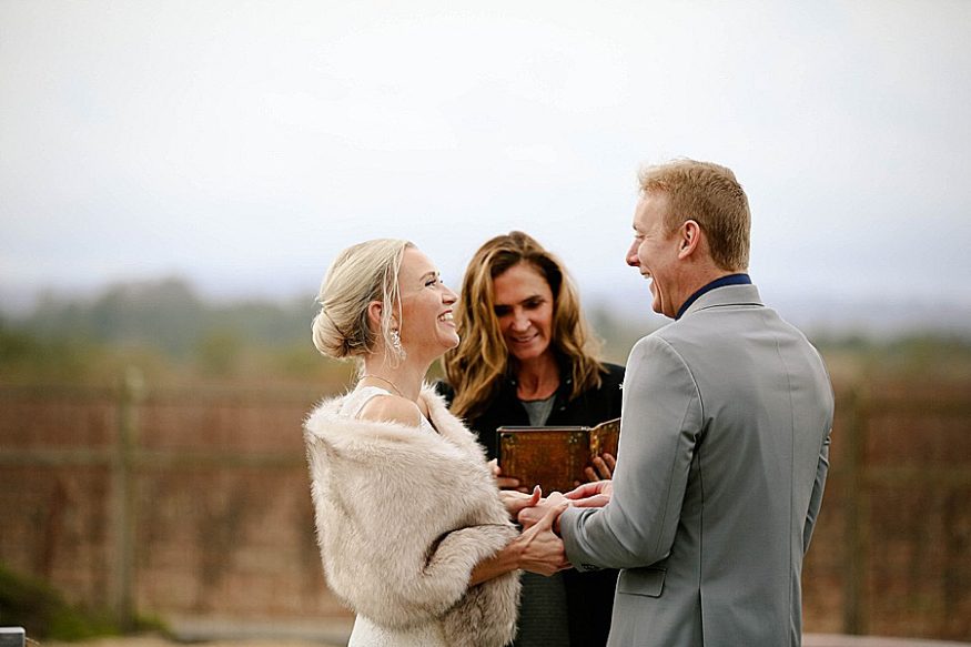 “Amber and Josh originally met 21 years ago and had small crushes on each other at the time. Little did they know that they had just met their future spouses. They parted ways and built successful happy lives. After awhile and many life changes the pair got a chance to re-meet 4 years ago. They immediately felt a connection, and when they started planning their wedding they wanted it to really be a celebration of their love without any of the fuss. The couple chose wine country in the fall because of the romance of it (just like their relationship). With just a few family members attending, and their amazing wedding planners Run Away With Me, the couple showed up to the venue and enjoyed getting married in the serene vineyards of Sonoma Valley. The bride accessorized for the cool temperatures with a wrap and kept her look elegant.